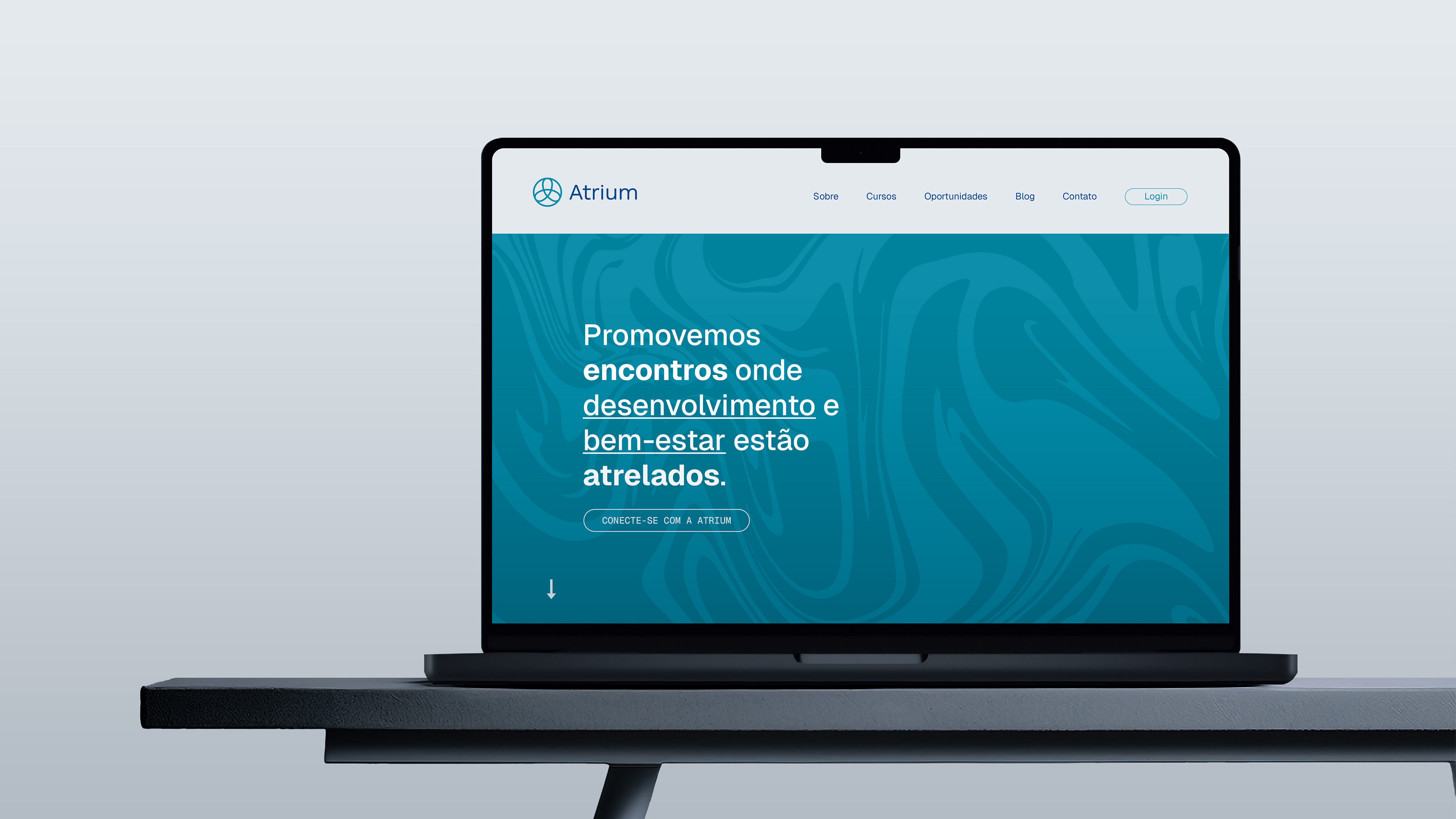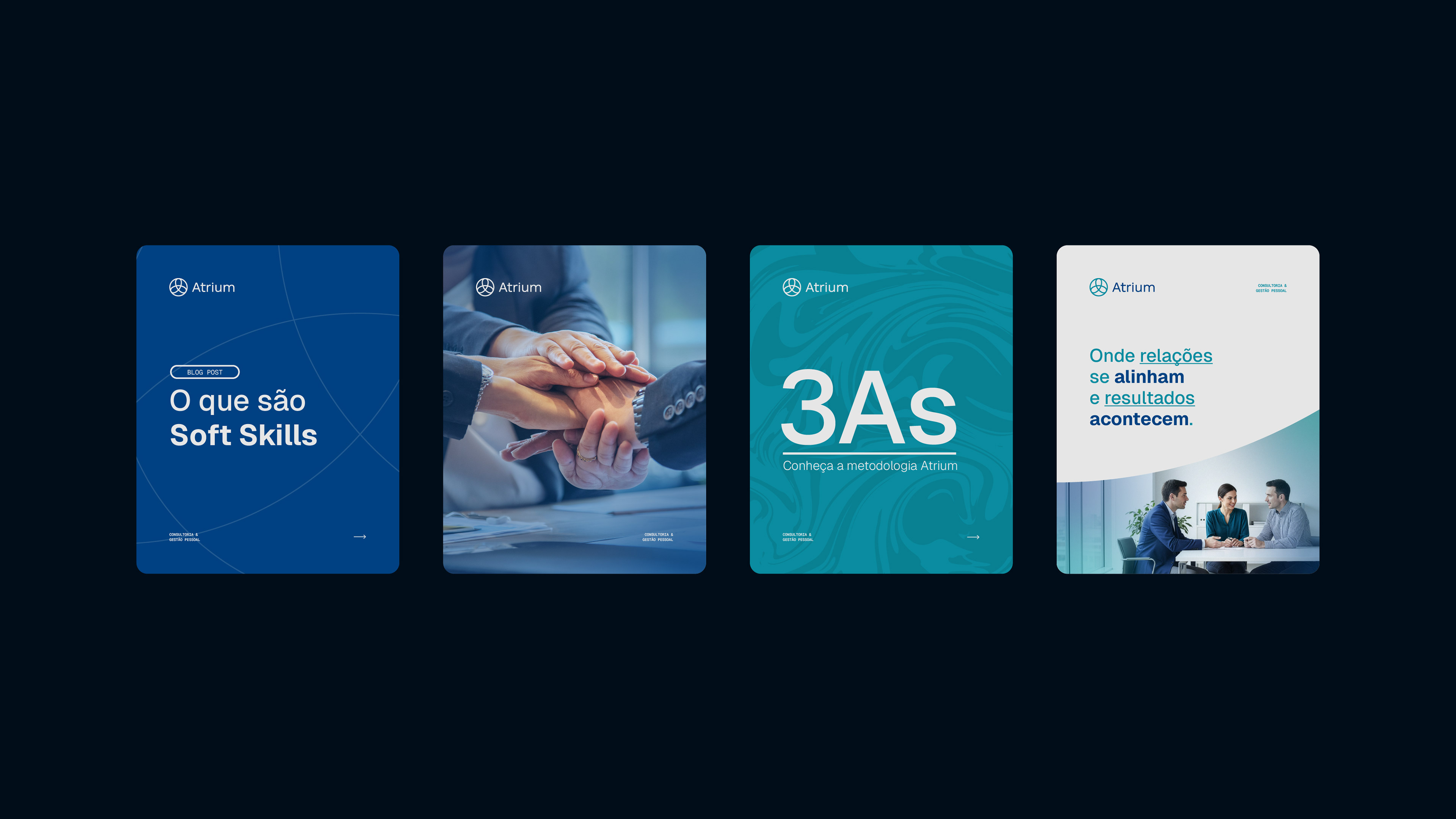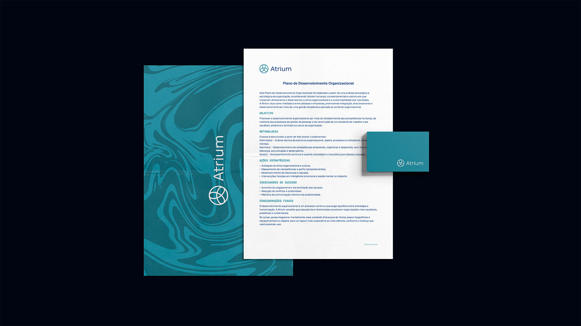 O símbolo da Atrium materializa visualmente a essência da metodologia. Três eixos entrelaçados formam uma única figura coesa, representando a interconexão entre a consultoria, o profissional e a organização - os três pilares Administrar, Aprimorar e Assistir em integração orgânica. O círculo que contorna a composição enfatiza proximidade, união e continuidade, reforçando a missão de promover conexões duradouras onde cada elemento se fortalece mutuamente.