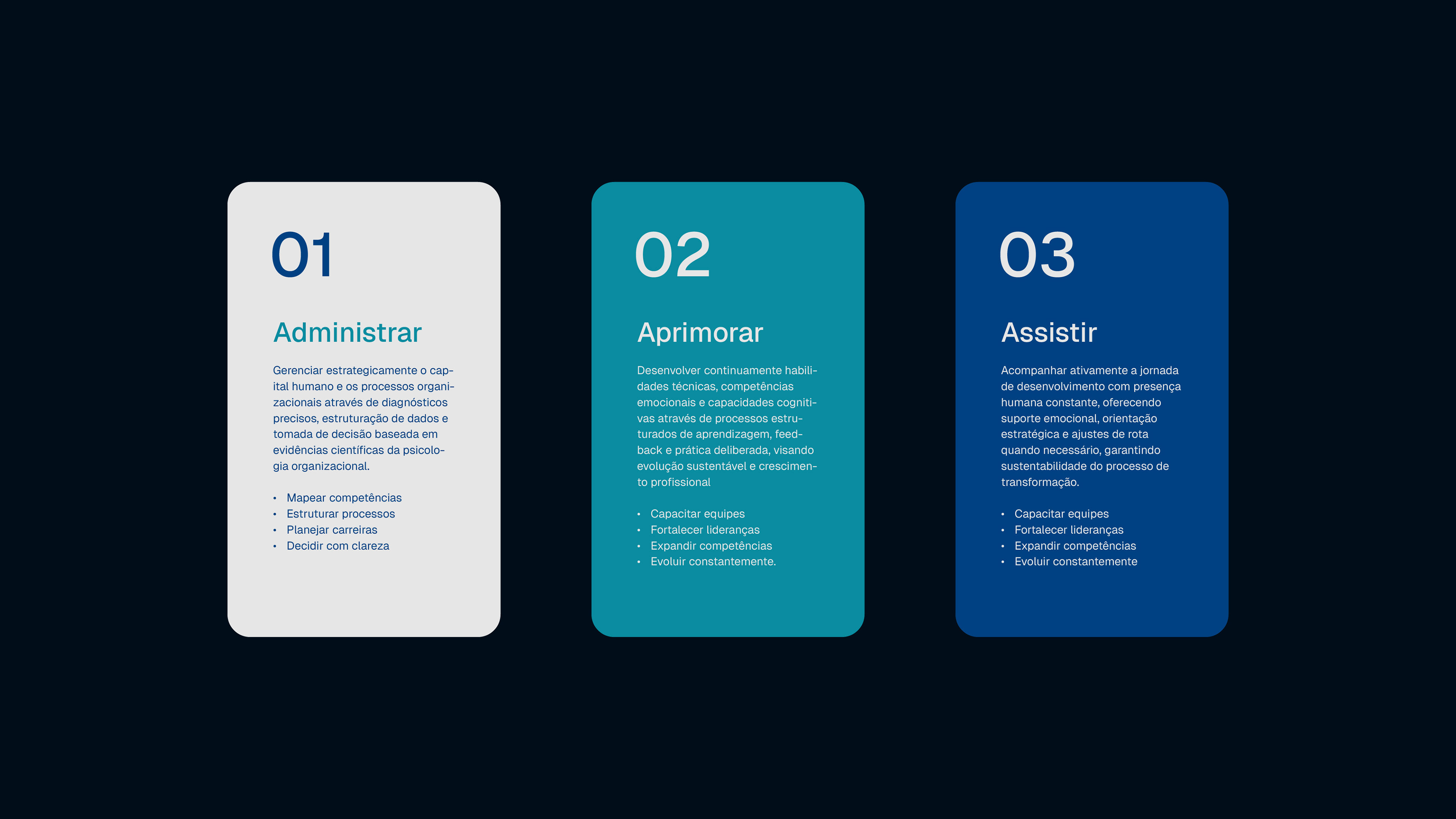 Sua metodologia proprietária se fundamenta em três pilares integrados: Administrar (gestão estratégica baseada em diagnósticos precisos), Aprimorar (desenvolvimento contínuo de competências) e Assistir (acompanhamento ativo com presença humana). Juntos, esses três movimentos criam conexões autênticas entre potencial individual e necessidades organizacionais, transformando carreiras e culturas empresariais de forma sustentável.