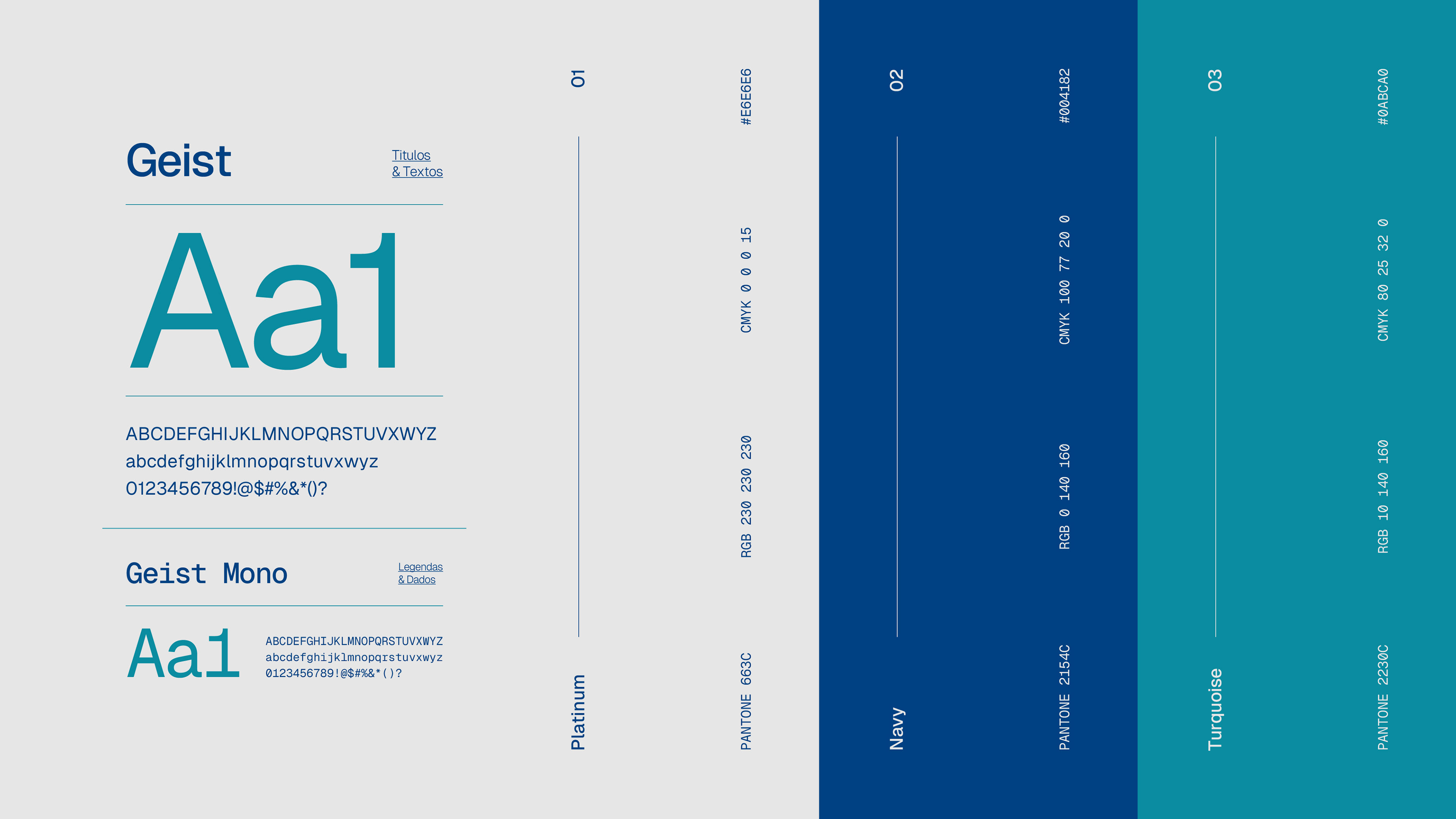 A escolha tipográfica reforça a dualidade técnica-humana da marca. Geist oferece versatilidade contemporânea e acessibilidade, enquanto Geist Mono traz precisão visual para dados e elementos técnicos. Juntas, criam uma identidade visual simultaneamente confiável e acolhedora, técnica e sensível.